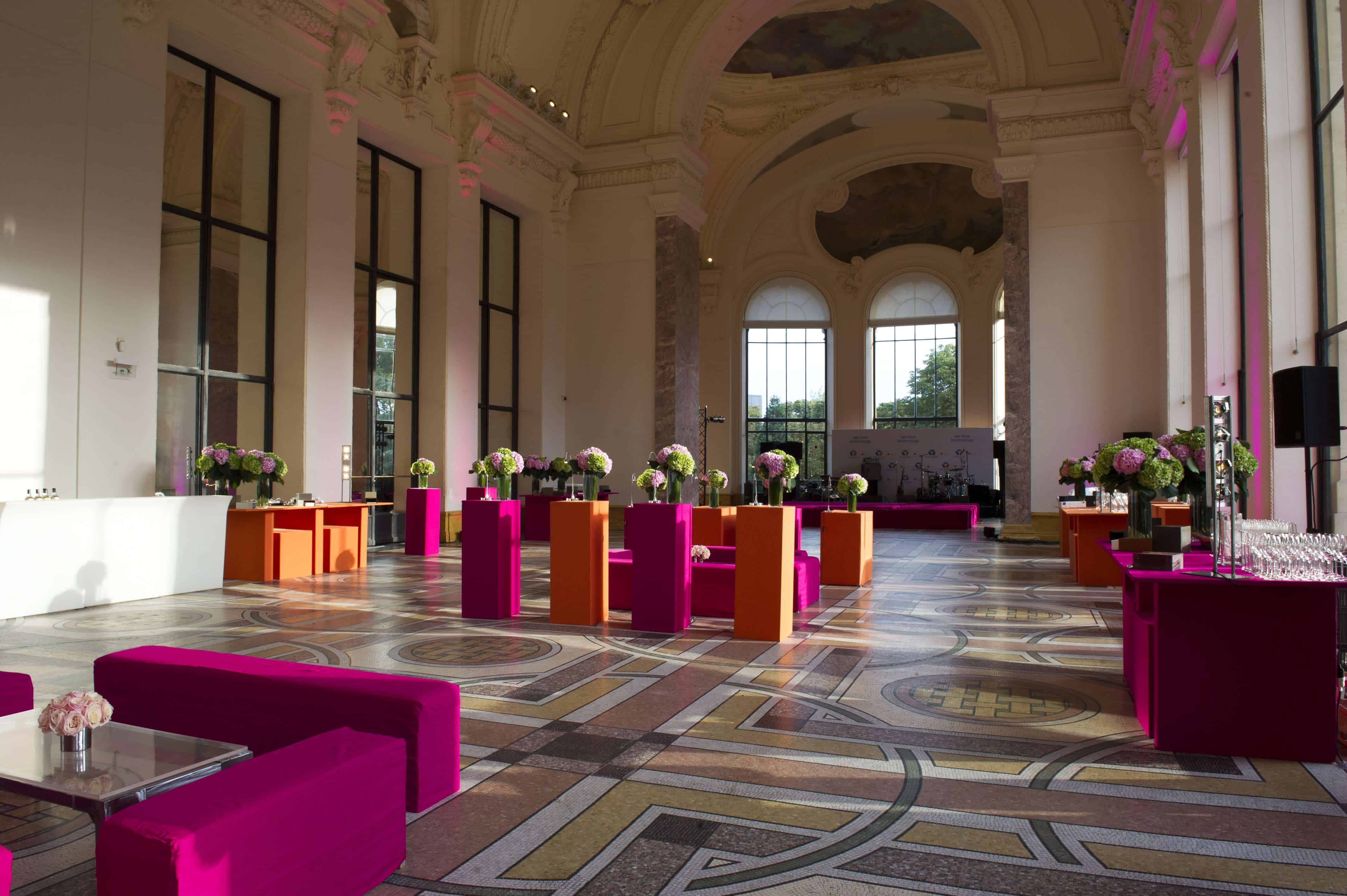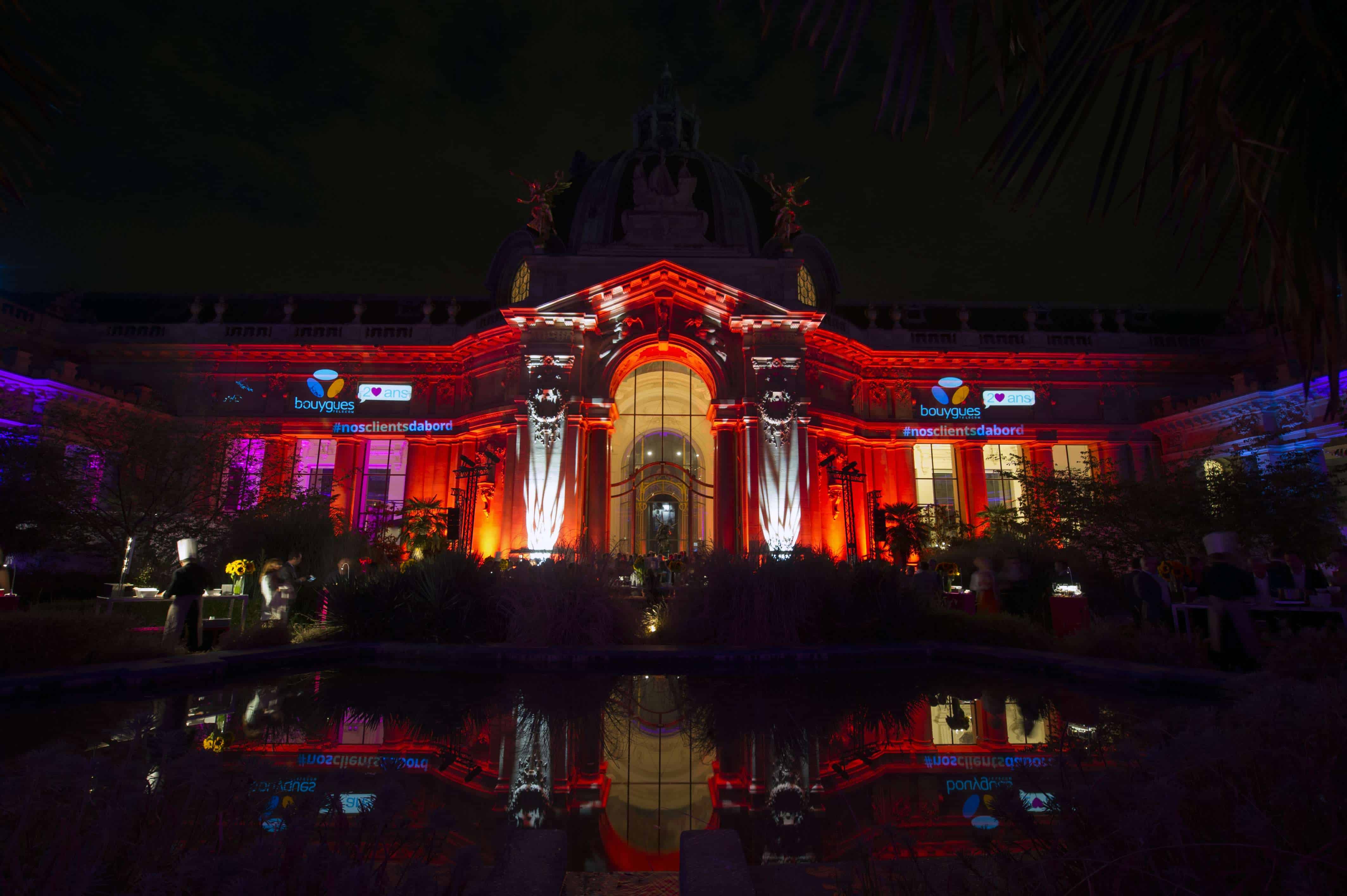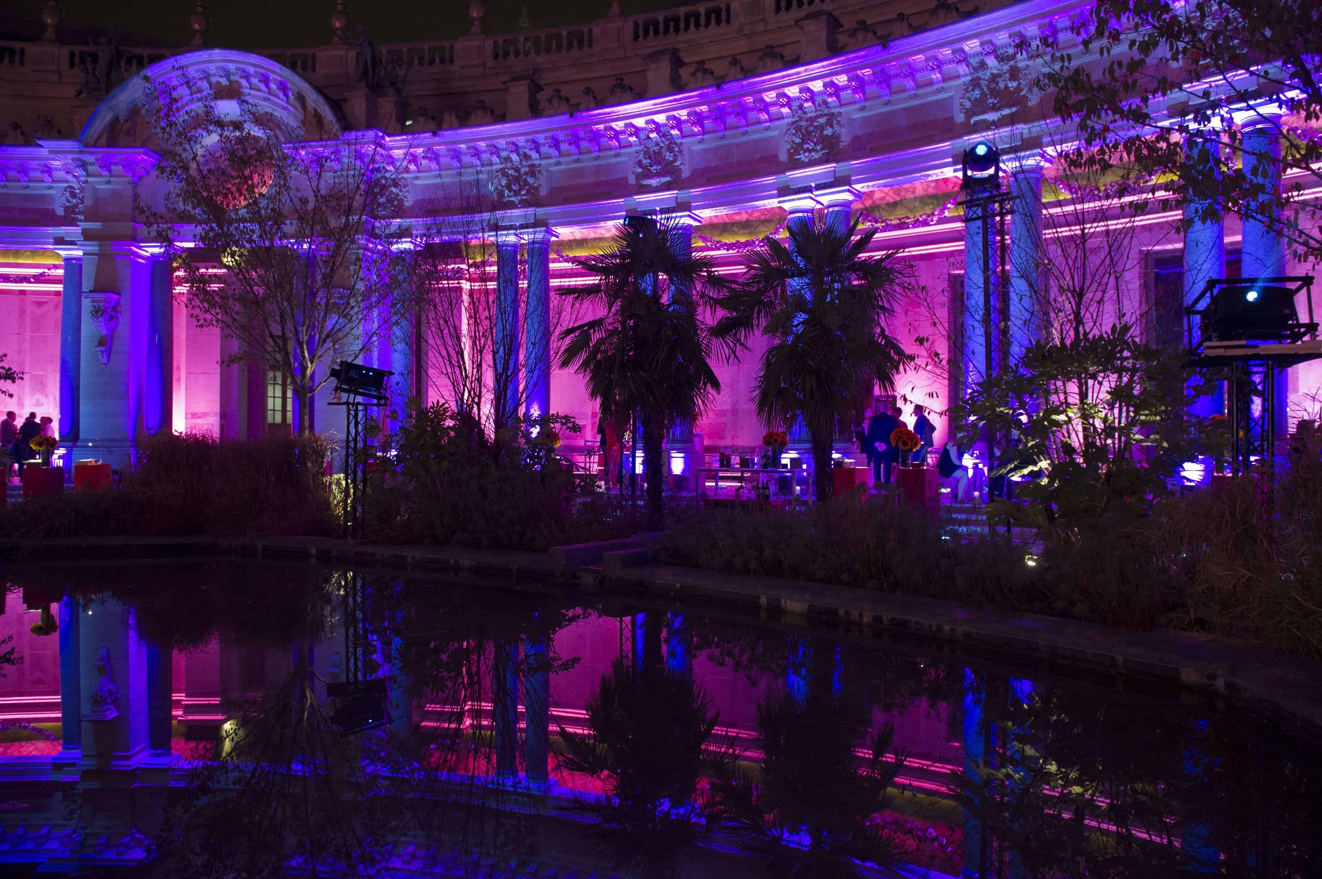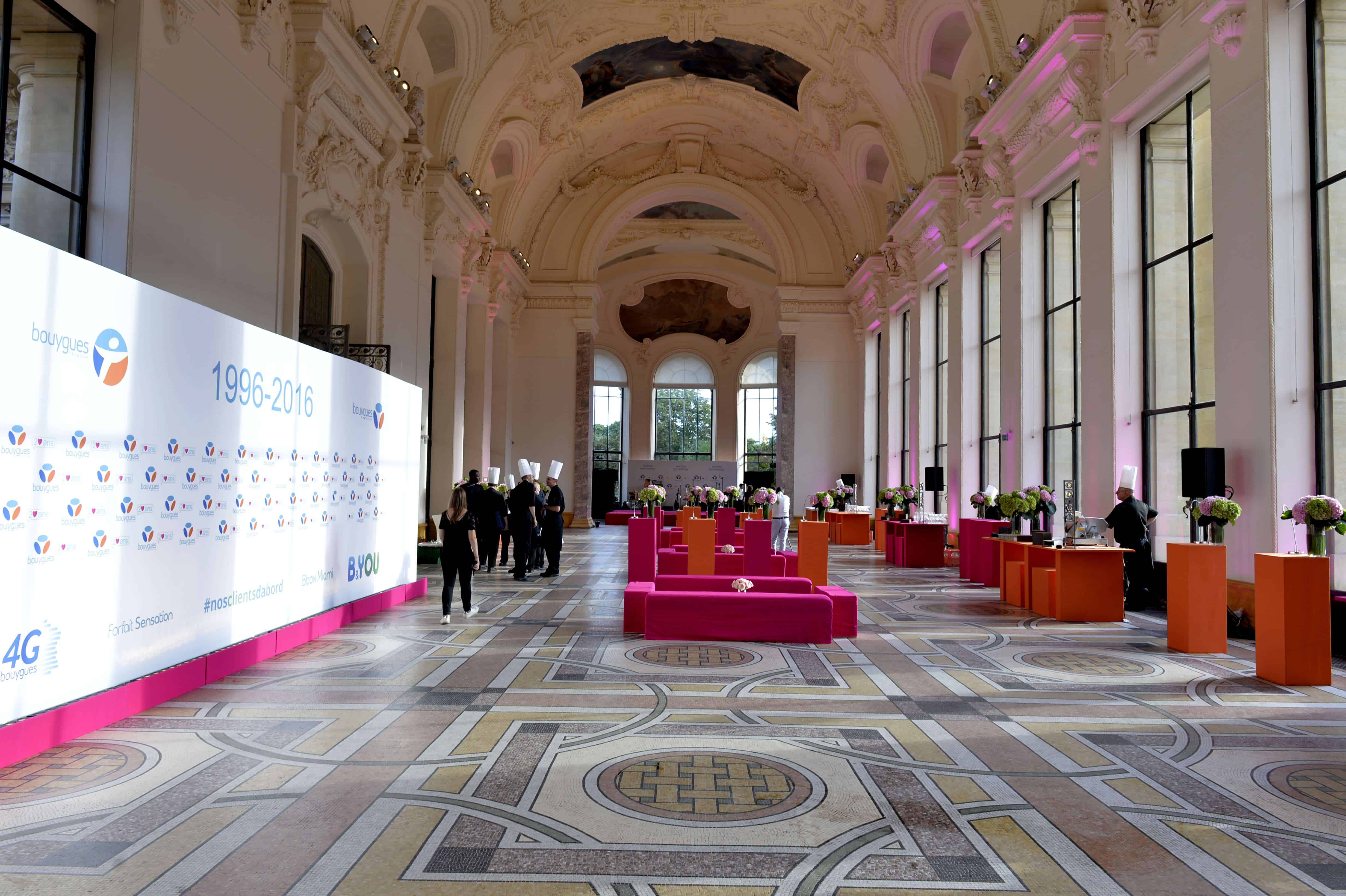 Aménagement de l’espace avec des créations de mobiliers sur-mesure, décoration florale, mise en lumière, signalétique et cocktail dînatoire, construction d’un dais d’accueil avec tapis rouge.