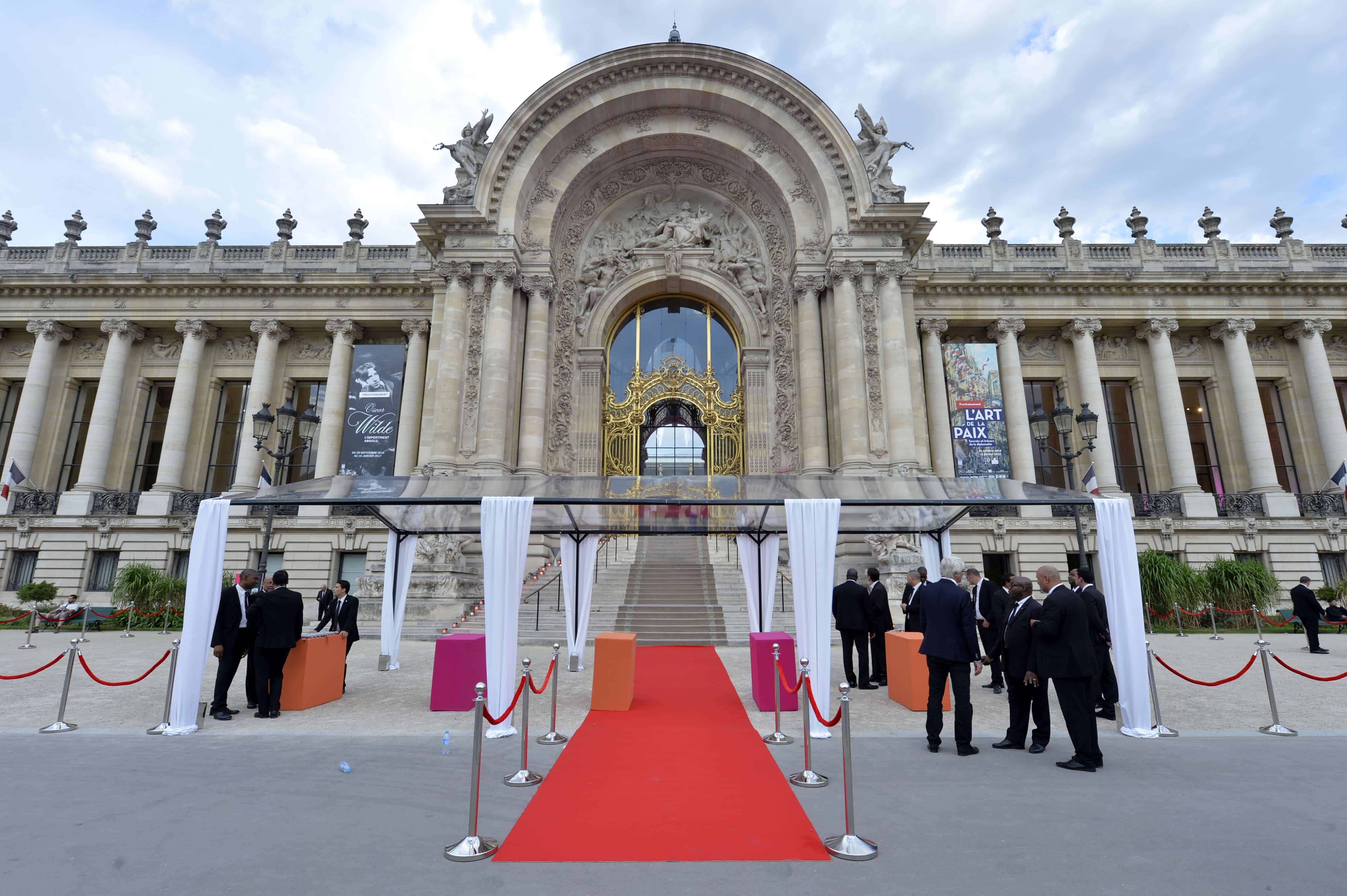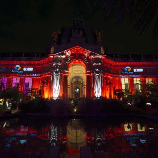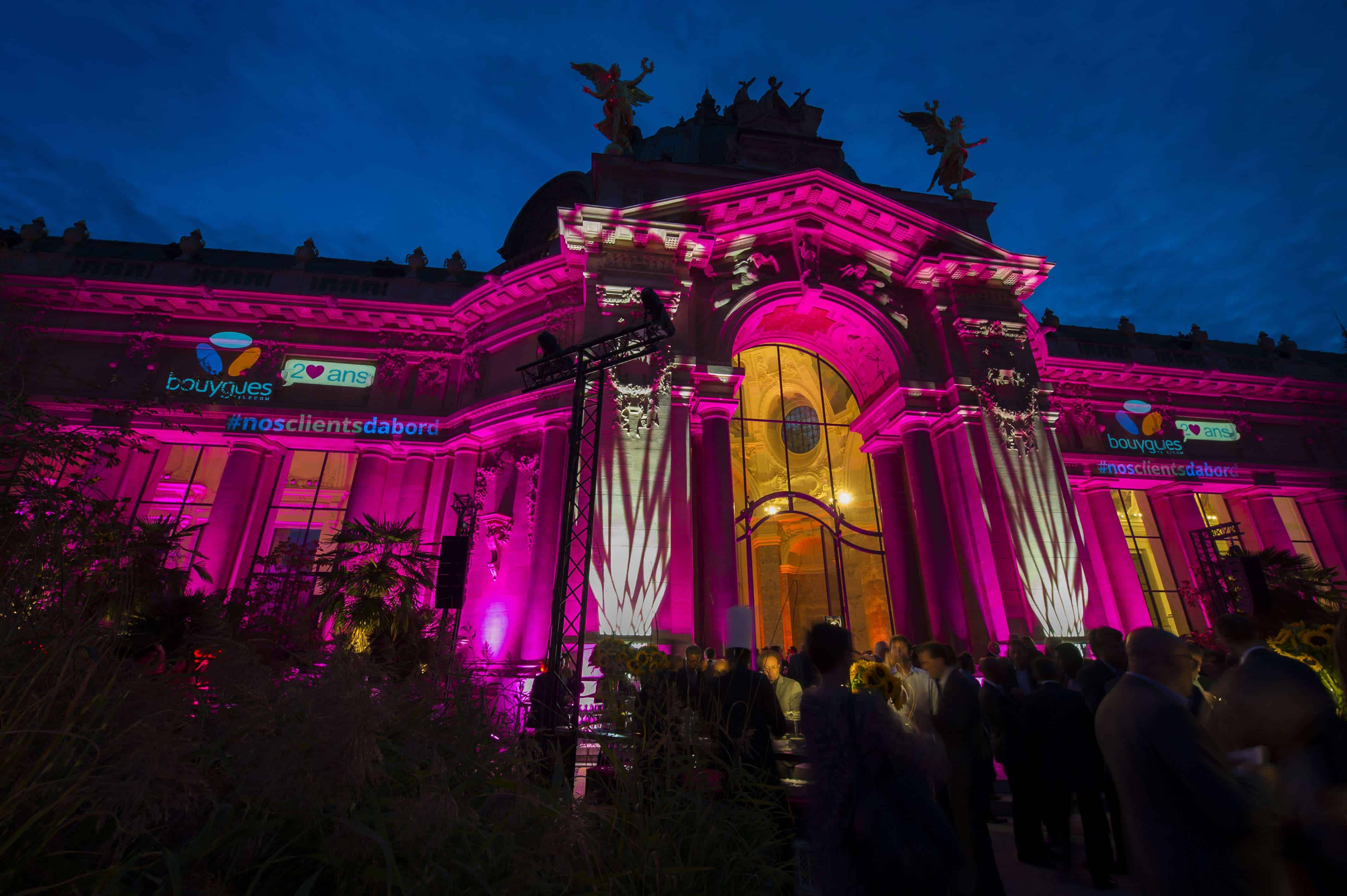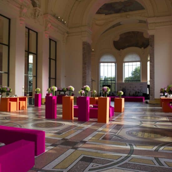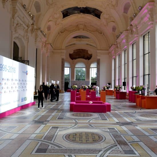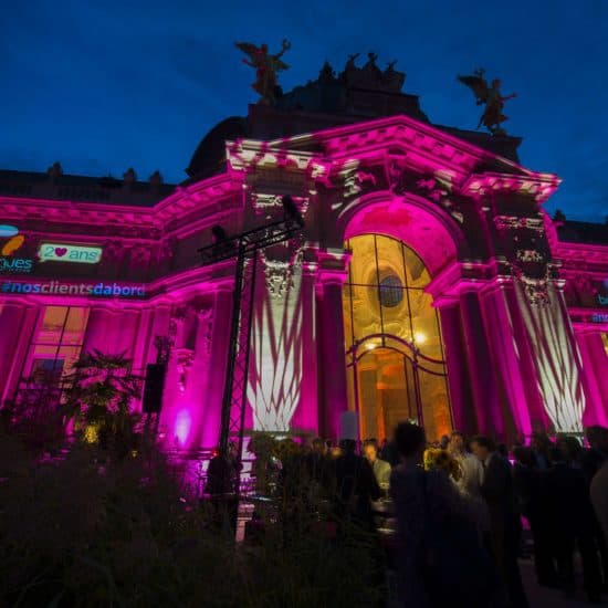 Aménagement de l’espace avec des créations de mobiliers sur-mesure, décoration florale, mise en lumière, signalétique et cocktail dînatoire, construction d’un dais d’accueil avec tapis rouge.